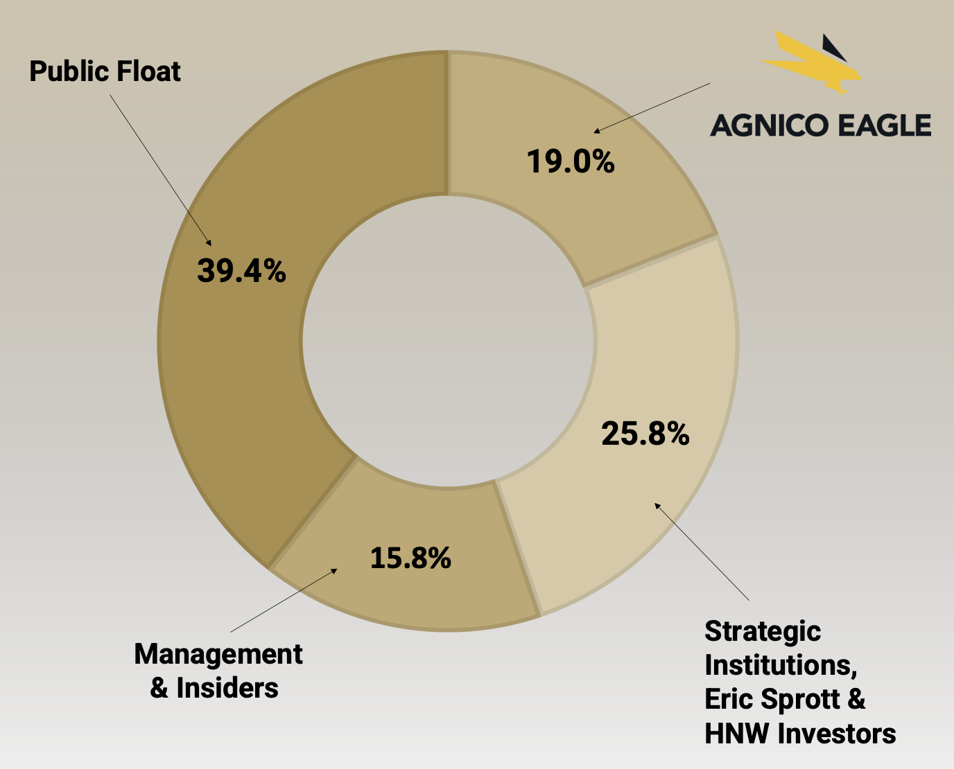 A key strength is the strategic anchor. Agnico Eagle Mines holds ~19-20% of the company and has consistently reaffirmed its commitment. Their participation lends credibility, technical depth and potential downstream resource leverage (e.g., joint ventures or offtake frameworks). The recent raise of CAD 23 million in October was upsized, demonstrating strong market interest and reducing near-term dilution risk. The share structure (approx. 221 million shares outstanding as of the latest fact-sheet) shows the company is sufficiently funded for exploration and early-stage development at this stage.